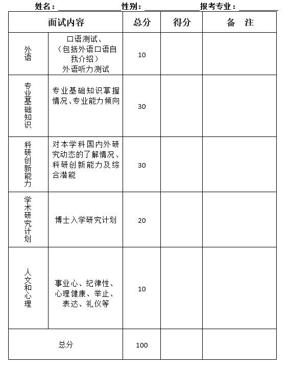 Ⅱ.综合面试:以一级学科为单位统一组织进行。每位考生约30分钟,满分100分。考生准备PPT介绍硕士研究生学习及研究工作,重点介绍博士入学研究计划。导师组通过提问重点考查考生的基本素养、学术能力、学术志趣、研究潜力、学术研究计划等。具体细则见附件。面试成绩不合格考生不得进入最后录取名单。