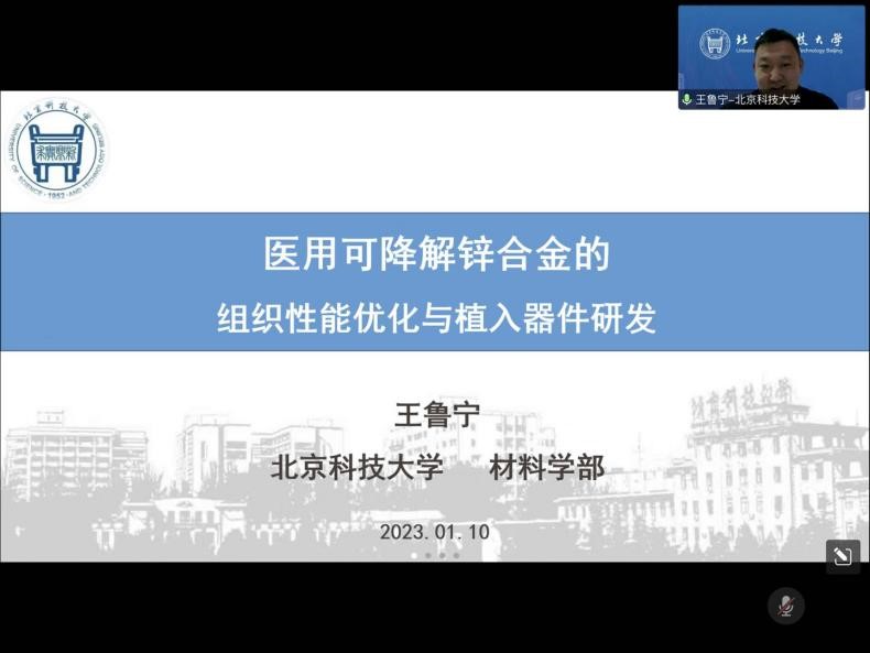 1月10日下午,北京科技大学副校长王鲁宁教授应邀为材料与能源学院全体师生做线上报告。王教授以材料前期的成分设计、力学性能改良以及后期的生物医用相关性能评价反馈为主线介绍了Zn-Li及Zn-Mn可降解锌合金设计与制备的系统性研究成果,同时就如何解决锌合金中第二相粗大的关键问题、锌合金表面粗糙度致塑性的创新性研究成果进行了阐述。报告内容详实、观点深刻富有见解、与会人员受益匪浅。在接下来的提问环节中,王鲁宁教授也一一为大家答疑解惑。线上互动气氛热烈、与会师生反响热烈。通过本次交流,王教授给学院师生带来了最新的学术前沿知识以及宝贵的科学研究经验,将为学院金属生物医用材料研究方向的发展起到积极的推动作用。