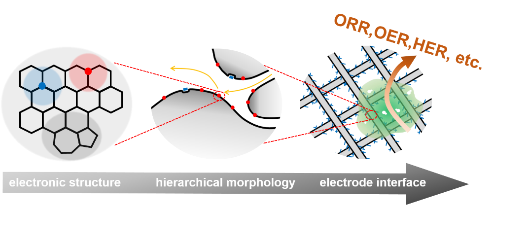 以氧气还原(ORR)、氧气析出(OER)、氢气析出(HER)、为代表的能源电催化是电解水制氢、燃料电池、金属空气电池等下一代清洁高效能源系统的核心技术,也是关键瓶颈。这些反应涉及多步质子耦合的电子转移过程,过电势很大,因而能量效率受限。目前,大量的研究工作集中在催化剂的开发研究,已有众多材料有望取代贵金属催化剂。但由于有气体参与,实际反应只能在气固液三相界面处有效发生。因此研究不仅需要从材料科学角度对催化剂进行设计,也要关注界面化学和反应行为,从不同层次综合优化,方可实现性能的最大幅度提高和在能源器件中的高效应用。