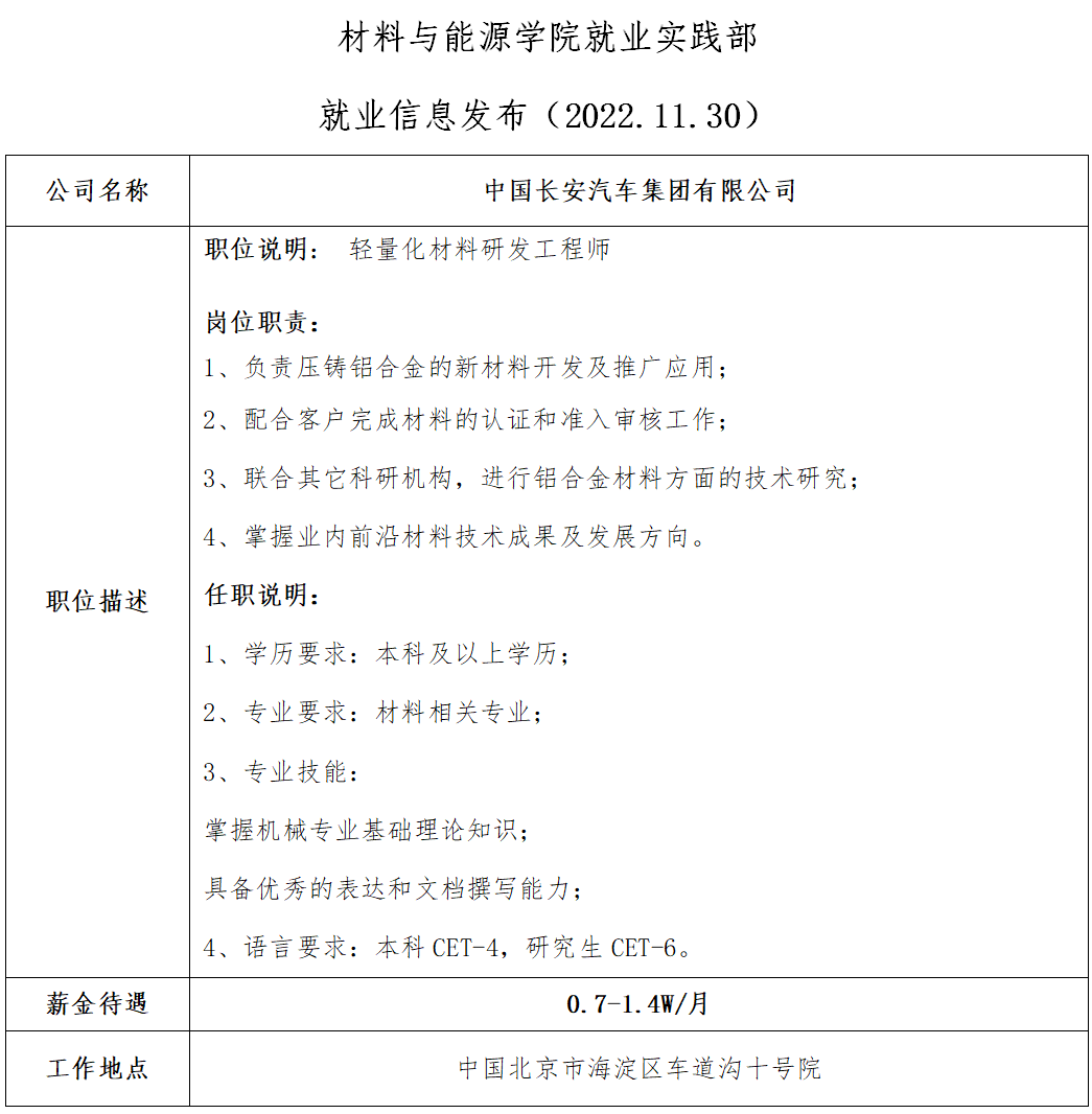 就业信息发布(2022.11.30)—中国长安汽车有限公司