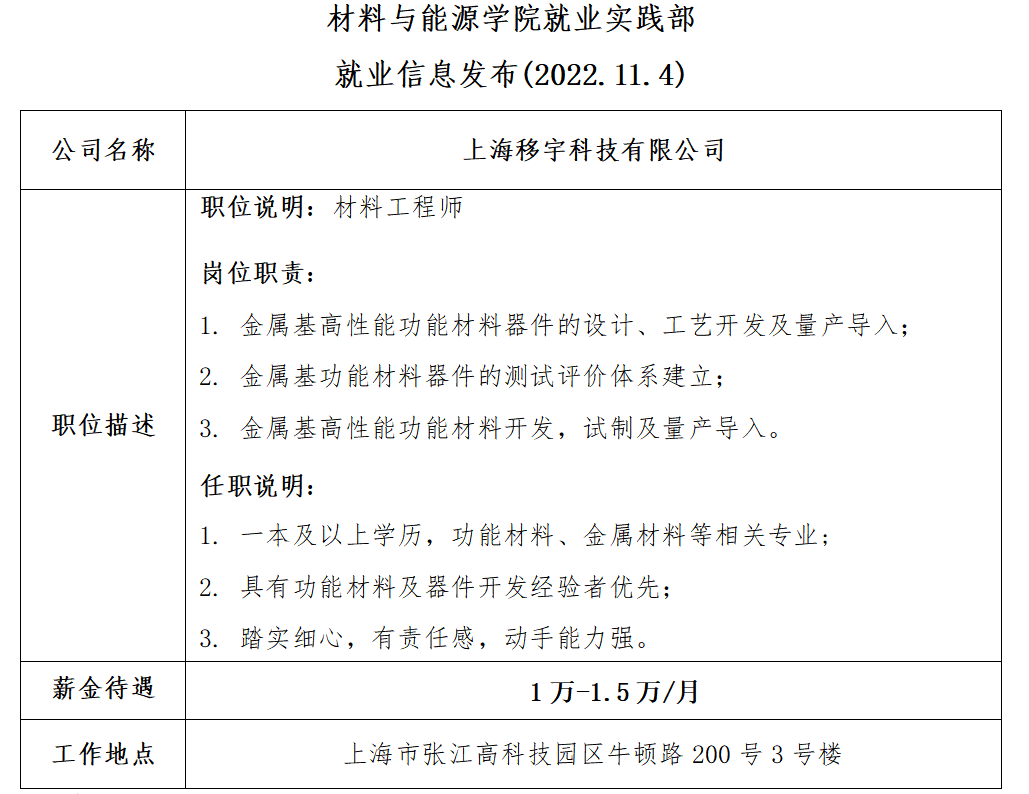 就业信息发布(2022.11.4)——上海移宇科技有限公司