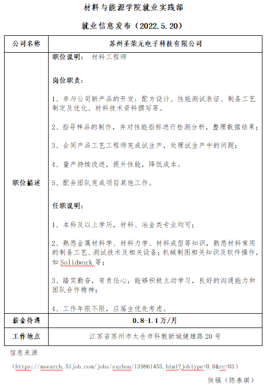 就业信息发布(2022.5.20)——苏州圣荣元电子科技有限公司