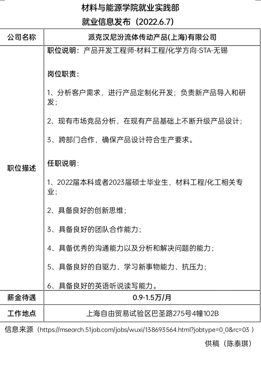 就业信息发布(2022.6.7) 派克汉尼汾流体传动产品(上海)有限公司