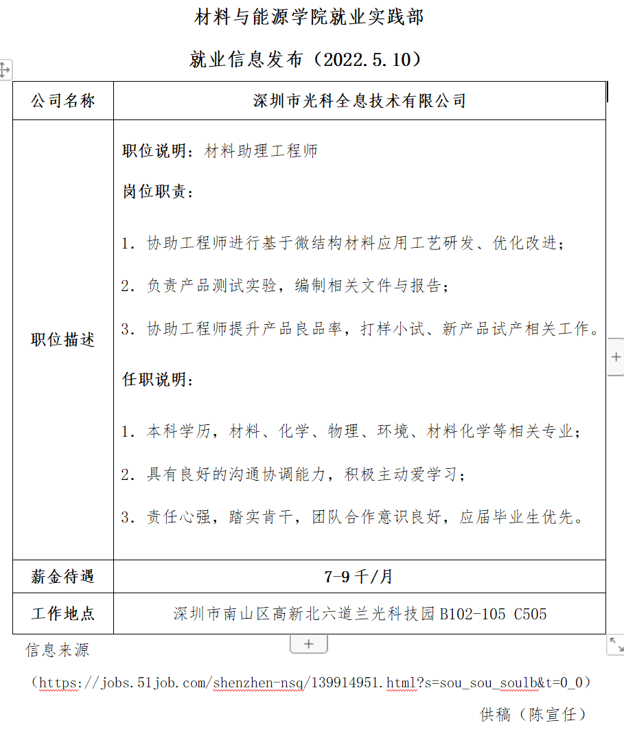 就业信息发布(2022.5.10)—深圳市光科全息技术有限公司