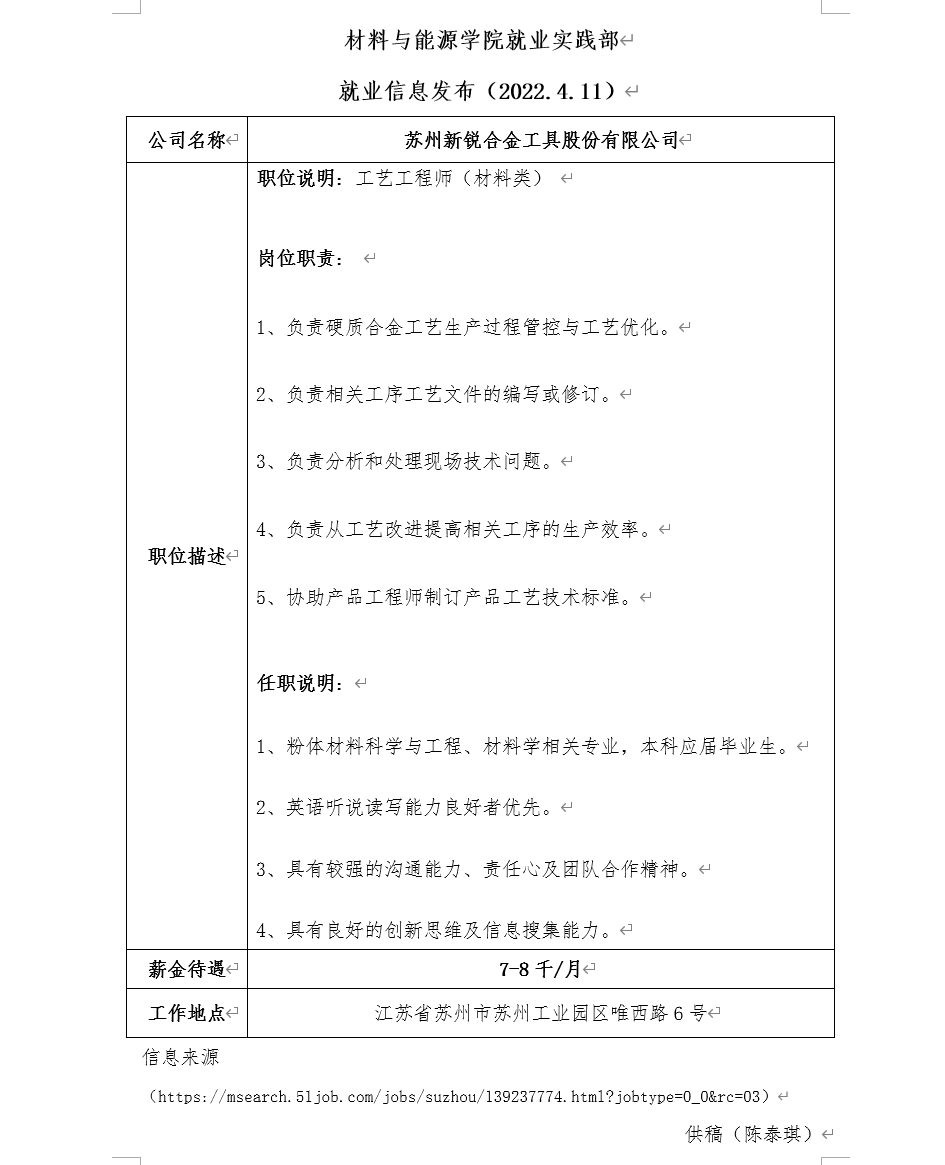 就业信息发布(2022.4.11)——苏州新锐合金工具股份有限公司