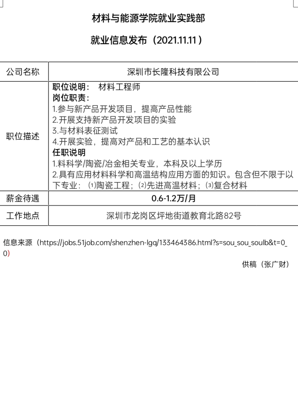 材料与能源学院就业实践部 就业信息发布-深圳市长隆科技有限公司(2021.1...