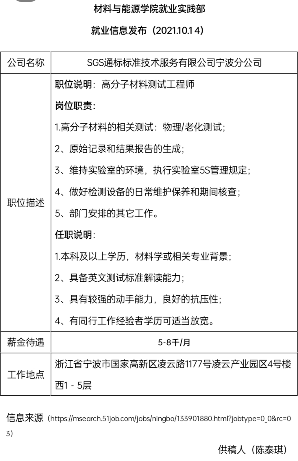 材料与能源学院就业实践部 就业信息发布(2021.10.14)