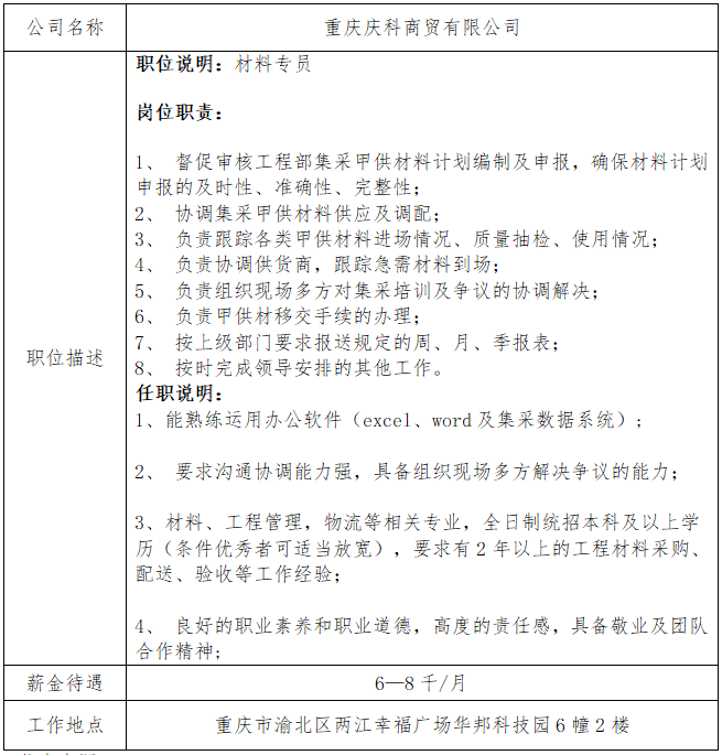 就业信息发布2021.6.11--重庆庆科商贸有限公司