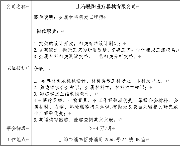 就业信息发布2021.6.14-上海暖阳医疗器械有限公司
