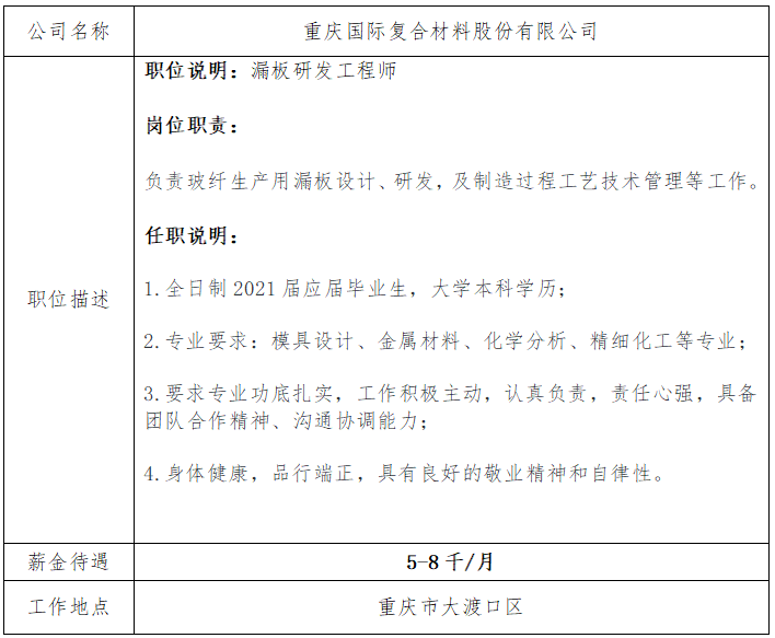 就业信息发布2021.04.17-重庆国际复合材料股份有限公司