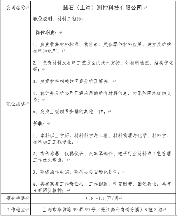 就业信息发布2021.4.20-慧石(上海)测控科技有限公司