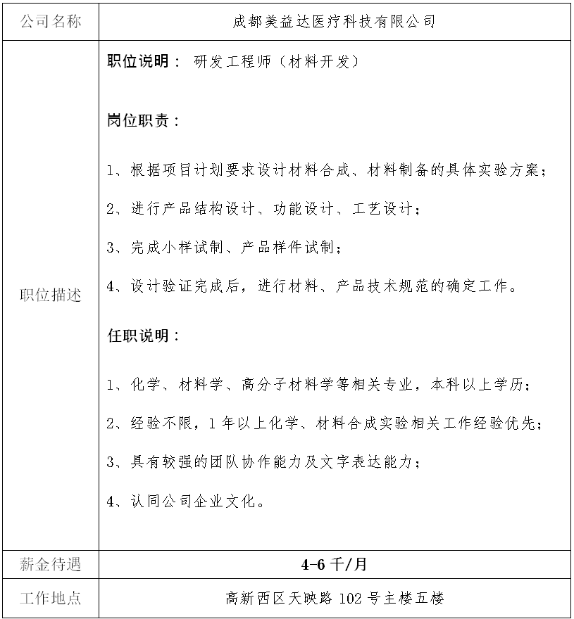 就业信息发布2020.12.22-成都美益达医疗科技有限公司