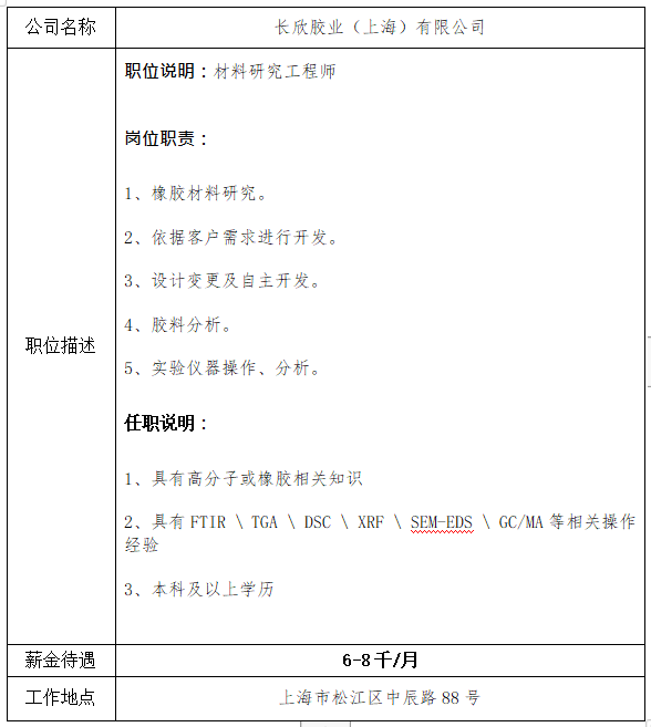 就业信息发布2020.11.9-长欣胶业(上海)有限公司