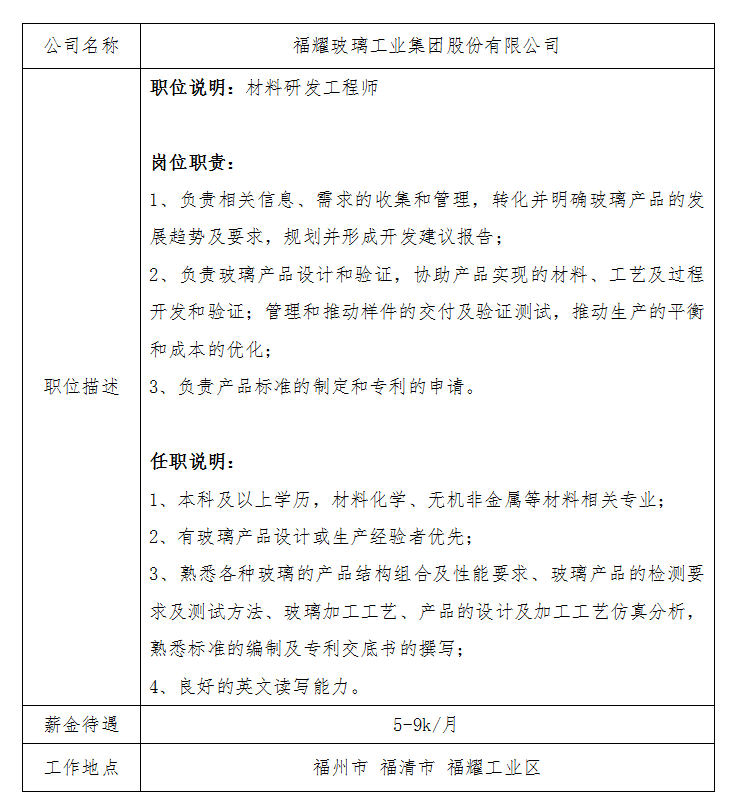 就业信息发布2020.10.04-福耀玻璃工业集团股份有限公司