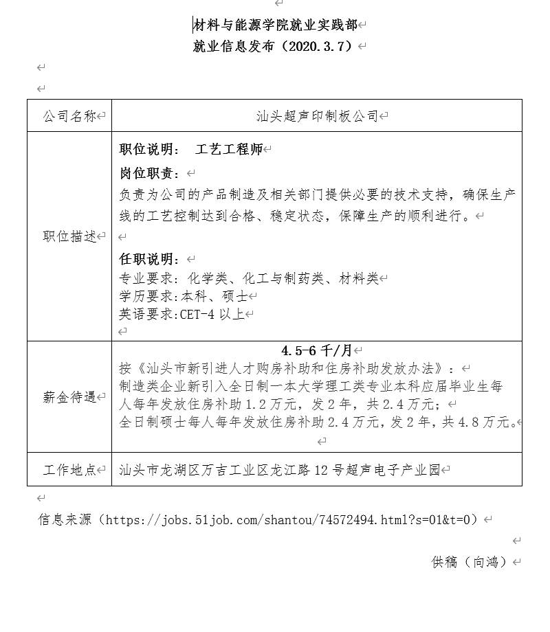 就业信息发布2020.3.7-汕头超声印制板公司