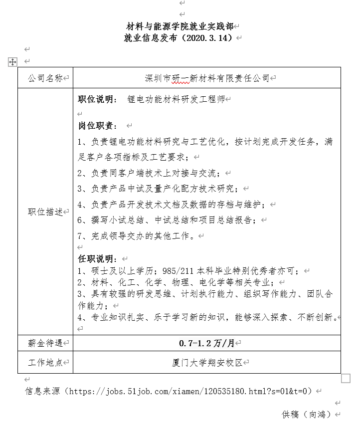 就业信息发布2020.3.14-深圳市研一新材料有限责任公司
