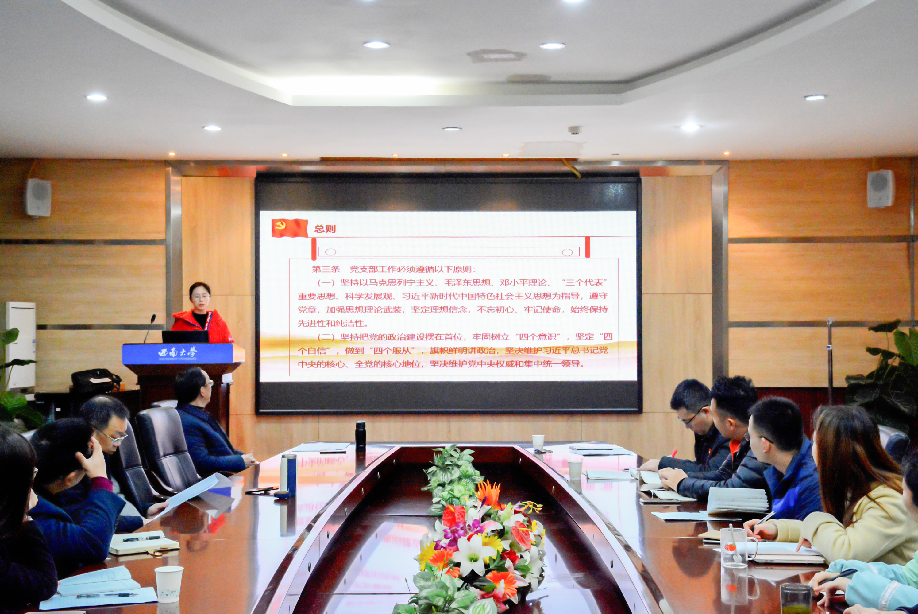 会议伊始,专职组织员居媛悦老师领学《中国共产党支部工作条例(试行)》(以下简称《条例》),结合学院实际对《条例》的部分内容进行了解读。《条例》以习近平新时代中国特色社会主义思想为指导,贯彻党章要求,既弘扬“支部建在连上”的光荣传统,又体现基层创造的新做法新经验,对党支部工作做出全面规范,是新时代党支部建设的基本遵循。