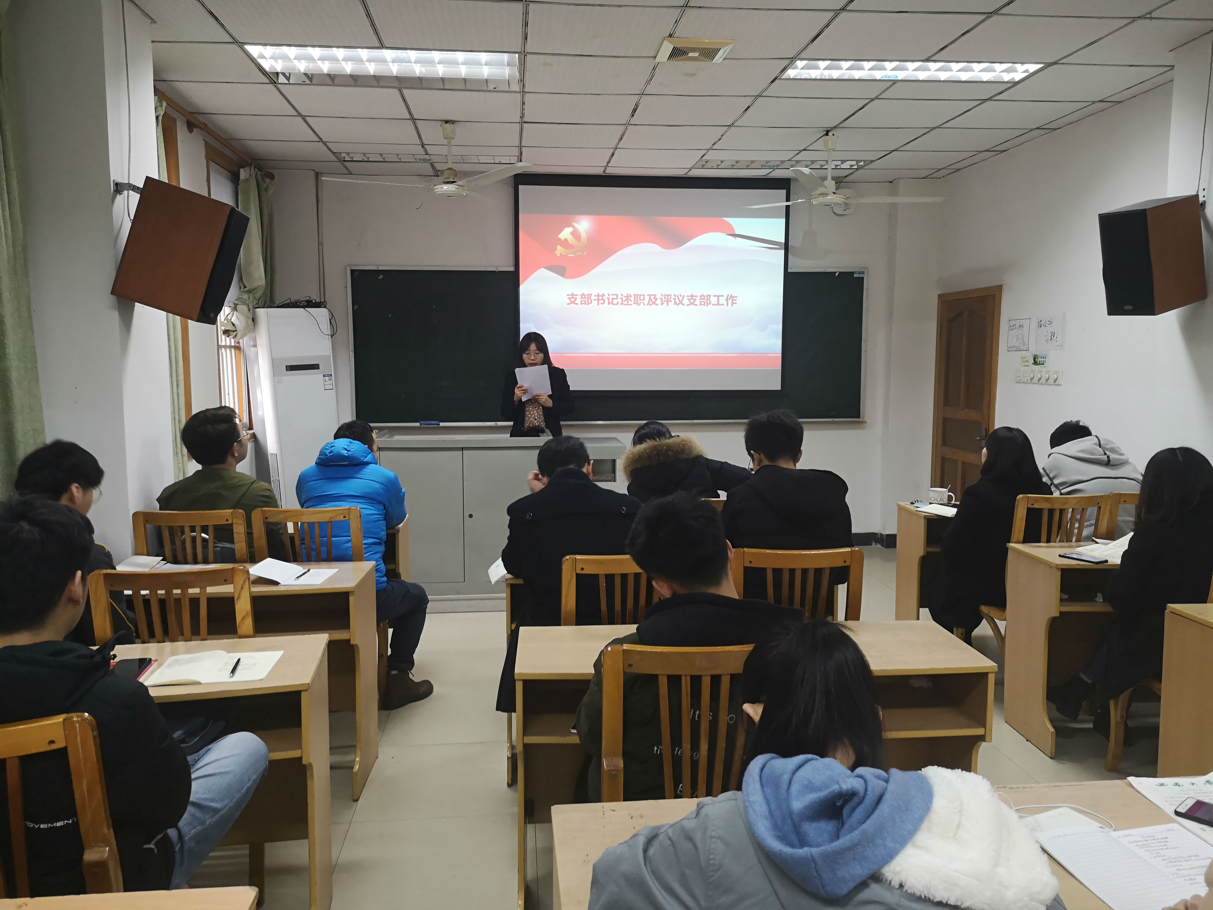 第二个环节是支部书记述职及评议支部工作,支部书记帅丁祺同志对上年度支部工作进行总结。她指出我们支部做到了注重制度规范,严格党员和入党积极分子的培养考察,上好“三会一课”,牢固树立“四个意识”、“四个自信”;坚持政治建设摆在首位,严格发展标准,严审材料;党员同志能够亮出党员身份,发挥榜样、引导作用。在接下来的支部建设中,会健全师生帮扶慰问工作,增强组织生活的灵活性、多样性,加强与其他支部的交流联系,搭建师生交流平台,使支部真正成为“党员之家,师生之家”。之后,何焕生同志指出,他发现支部很多同志对入党程序不是很熟悉,所以可以对入党流程进行常态化培训,让积极分子们更加明确各阶段自己应该做什么,朝哪个方向努力。潘欣欣同志表示,支部党员都很优秀,但我们不能仅仅自己优秀,要用自己优秀品质带动身边同学一起进步;饶席同志则说支部活动形式可以更多样,比如去外面参观学习。入党积极分子李静川表示,在组织生活会上,有些同志交流发言不够积极,希望大家踊跃表达自己观点,加强讨论。