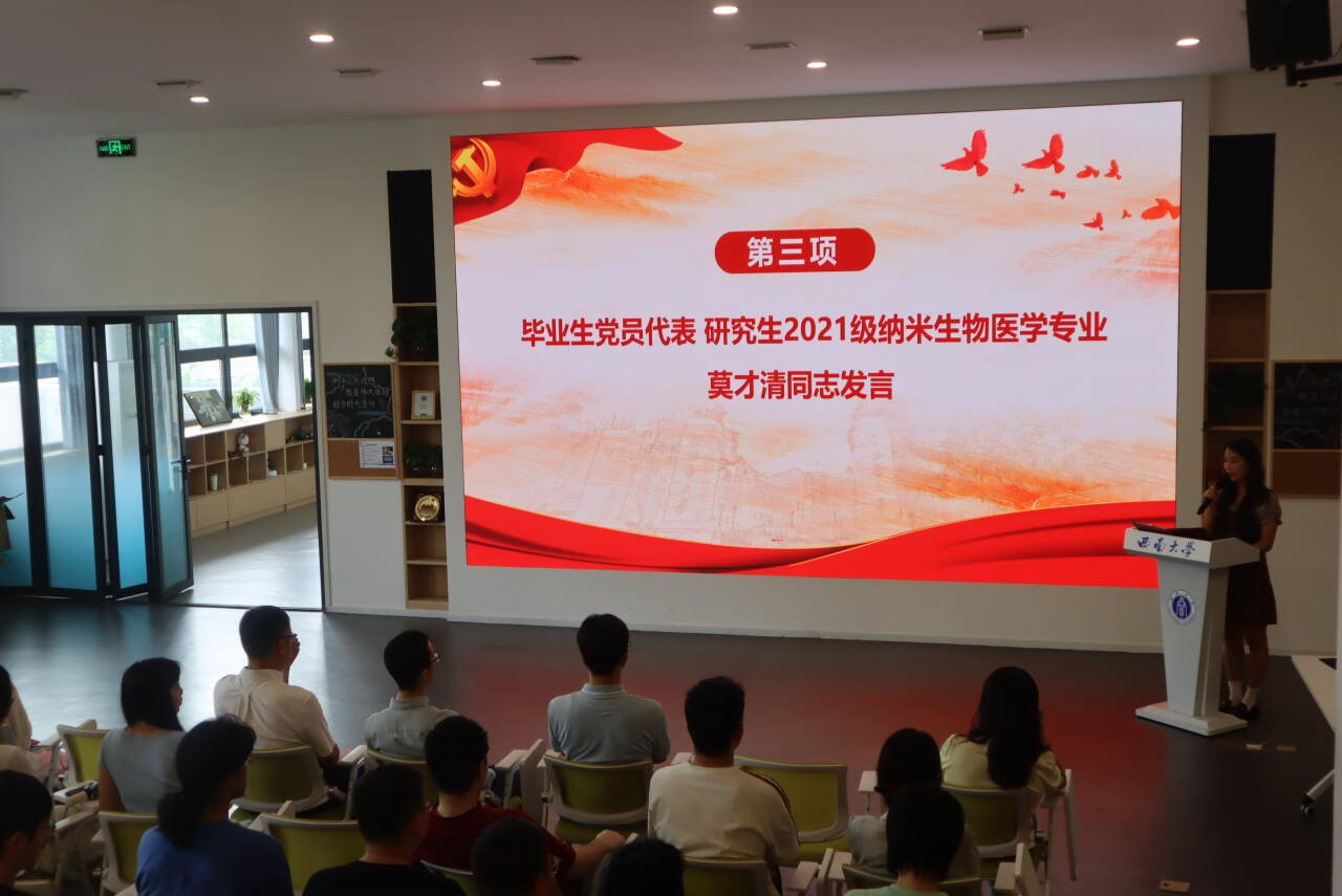 教师党员代表通过录制的视频为全体毕业生党员送上祝福,对大家顺利毕业表示祝贺,对即将开始人生新征程的同学们表达了真诚的祝福与殷切的期望。毕业生党员代表莫才清在发言中号召全体毕业生党员传承“含弘光大、继往开来”的西大校训,无论是走向平凡的工作岗位,还是继续求学深造的路途上,一定要以优秀共产党员的标准严格要求自己,努力学习,扎实工作,回报母校,回报社会,在各行各业发光发热,为中华民族伟大复兴贡献所有的才智,不负青春,不负韶华。