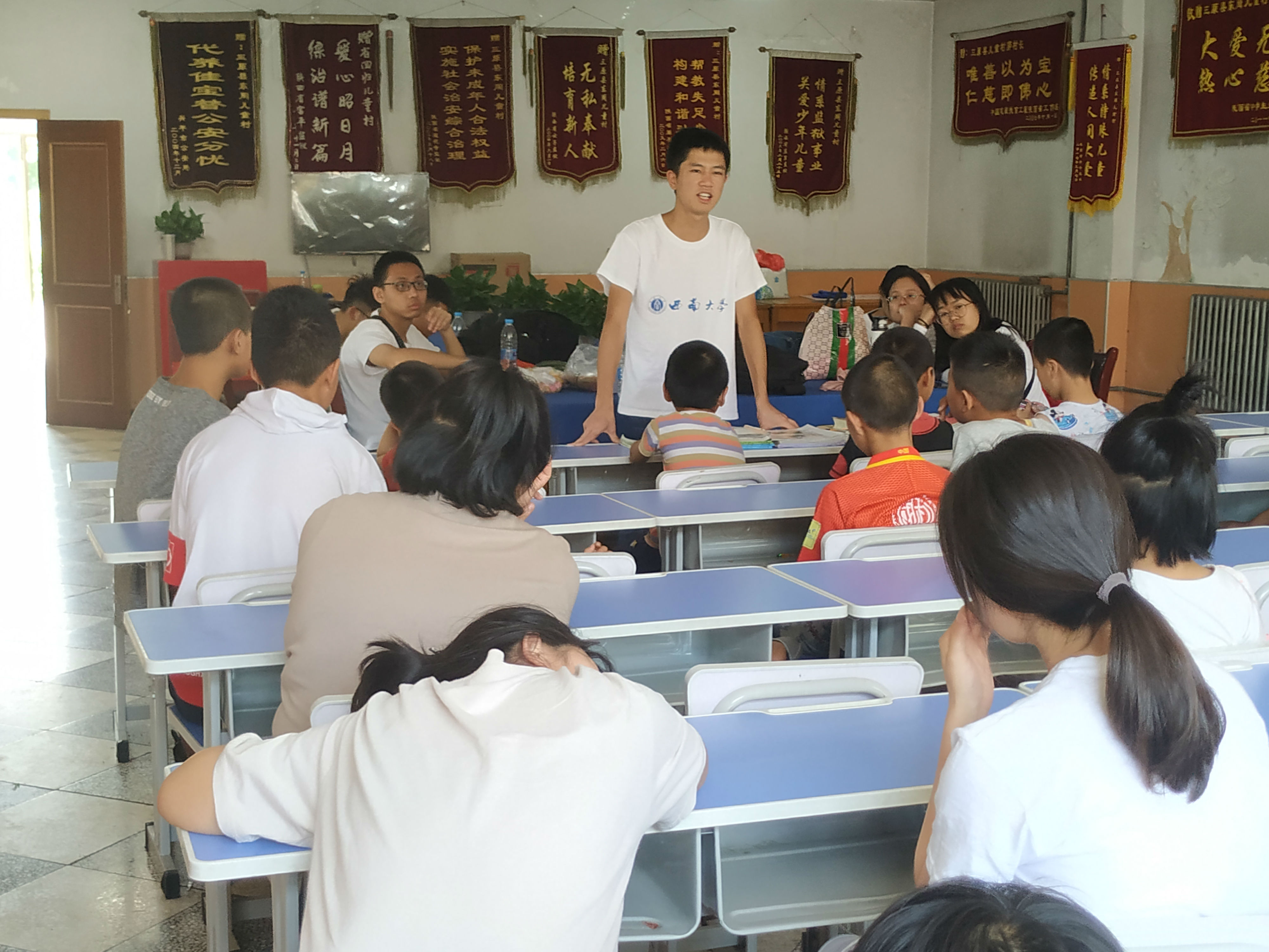 7月12日,best365英国在线体育官网材料与能源学院三下乡陕西西安小分队来到了陕西省三原县东周儿童村,联合来自陕西科技大学的志愿者们在此开展了一堂特殊的“公益课”。小分队成员同志愿者们一起,和孩子们玩了丢手绢,你画我猜,老鹰捉小鸡,掰手腕,抢凳子等团辅小游戏。又与一些孩子一对一谈心,帮助他们打开心扉。此外,小分队成员还给孩子们带来了张学良、杨虎城的故事,帮助孩子扩展见闻,领略红色内涵。最后,小分队成员与志愿者、孩子们合影留念。