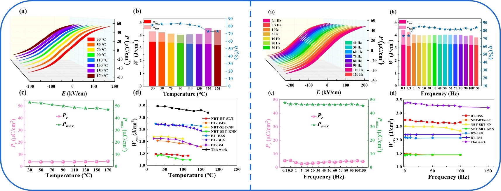 采用上述策略制备的(Na0.5Bi0.5TiO3-BaTiO3-Sr0.2Bi0.7TiO3-Dy3+-VPP,NBT-BT-SBT-Dy-VPP)陶瓷在270 kV/cm电场下获得了4.87 J/cm3的超高储能密度,且其在200 kV/cm和220 kV/cm下具有良好的温度(30~ 170°C)和频率(0.1~ 150Hz)稳定性(Wd ≈ 3.3 J/cm3)。