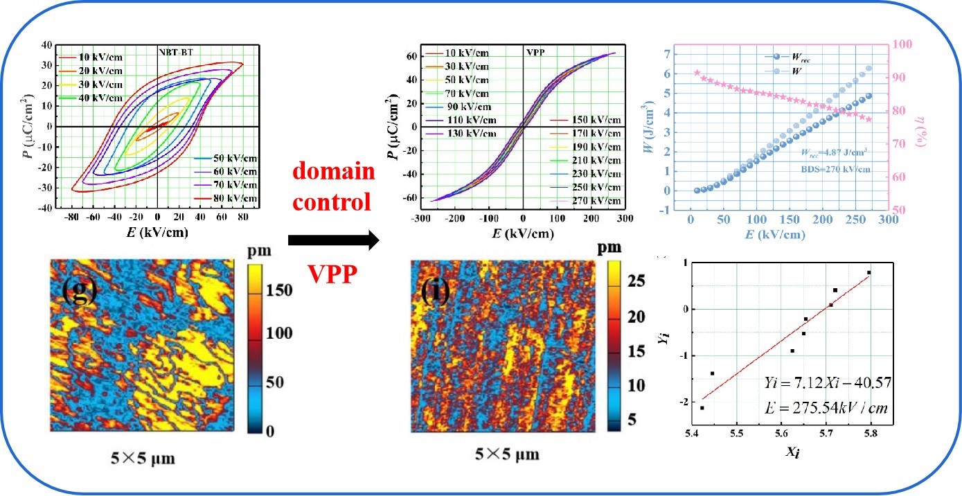 钛酸铋钠/钛酸钡(Na0.5Bi0.5TiO3-BaTiO3,NBT-BT)基无铅陶瓷具有典型的铁电特性。然而,NBT-BT基陶瓷通常具有宏畴,导致高的剩余极化和大的矫顽场,难以作为储能材料广泛应用。该工作通过电畴调控(宏畴变微畴)和改善耐电场强度非本征因素(提供致密度等)策略,有效降低了介质陶瓷的剩余极化和矫顽场,同时大幅提高了介质陶瓷的击穿电场强度,最终获得高储能密度的钛酸铋钠/钛酸钡基陶瓷。