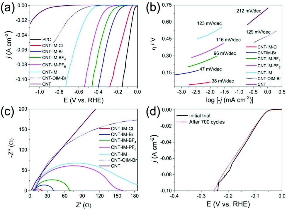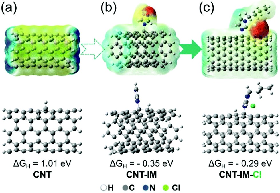 图3:IL-CNTs的吸附自由能计算 研究表明,原位制备的IL-CNTs中IL直接与CNTs连接,能够最大程度的影响材料表面电子结构,有利于析氢中的电子转移与反应物吸附,从而获得较好的催化活性。同时通过改变IL的结构等条件,进一步提高催化活性。