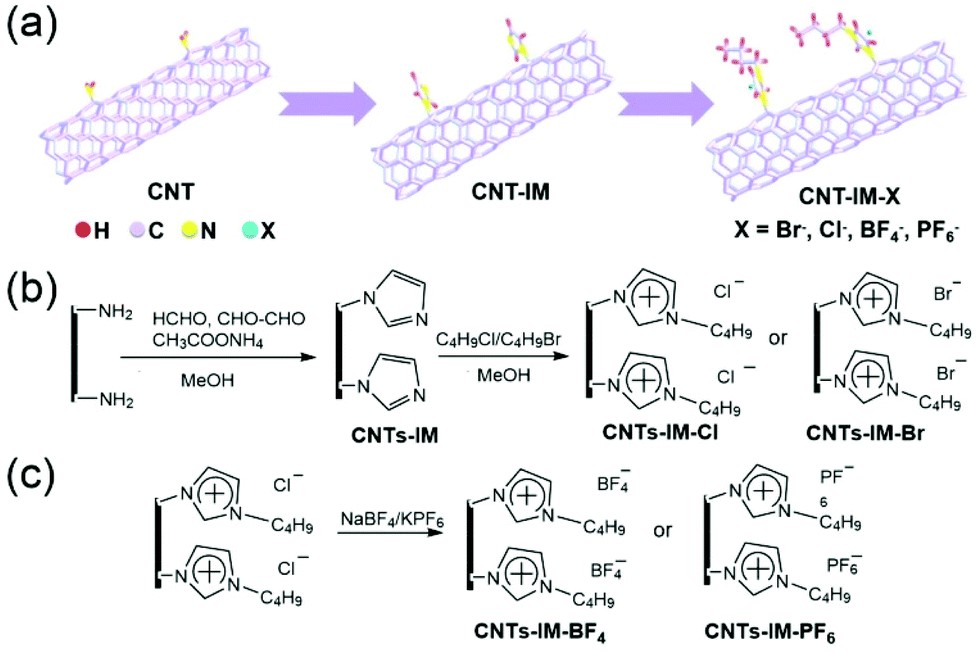 非金属材料由于较低的成本、较大的比表面积、优秀的电导率与稳定性、无重金属污染、多样的形貌结构等特点,被广泛用于析氢催化剂制备。由于离子液体(IL)独特的物化特性,离子液体-碳纳米管(IL-CNTs)非金属复合材料在电催化领域有巨大的应用潜力。但是由于IL合成与IL-CNTs制备方法的限制,IL与CNT之间相互作用很弱,IL很难影响材料表面的电子结构,不利于电子转移与反应物吸附,催化活性低。基于此,本研究提出了一种全新的IL-CNTs材料制备方法,即CNTs上原位合成IL,直接得到IL-CNTs。