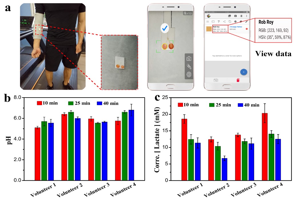 图2.(a)人体佩戴的护臂-可穿戴系统及基于智能手机获得的相应图像和数据;四名健康男性志愿者在运动10、25和40分钟后测试的pH值(b)和乳酸浓度(c)。