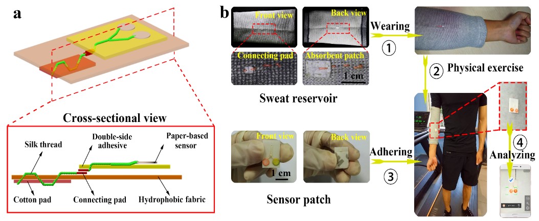图1. 线/纸基可穿戴系统的结构及其与智能手机相结合用于汗液现场分析
