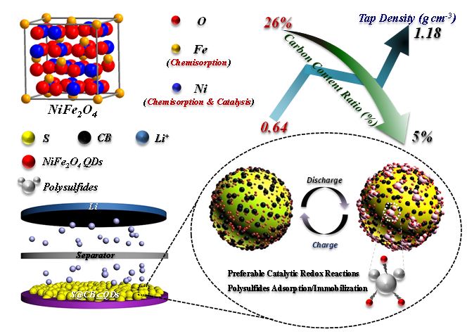 近日,best365英国在线体育官网材料与能源学院蒋建课题组提出了一种正极引入多功能NiFe2O4量子点以最小化碳使用量的设计方案,文章第一作者为研究生二年级学生李宁,该工作成功发表在《Nano-Micro Letters》上,标题为“Curtailing Carbon Usage with Addition of Functionalized NiFe2O4 Quantum Dots: Toward More Practical S Cathodes for Li-S Cells”。该成果表明,引入的NiFe2O4量子点具有良好的导电性、高的振实密度 (~1.32 g cm-3)、低的比表面积 (~19.9 m2 g-1)且对多硫化物具有极好的化学吸附和催化作用。同时,选用NiFe2O4量子点作为碳添加剂替代品,使正极整体碳含量降低到5%水平,从而避免电解液的过度消耗,确保特定能量密度参数。为了验证NiFe2O4量子点的多功能化,我们特意在不加LiNO3电解液情况下评估了电池的电化学性能。代表性示意图如下所示: