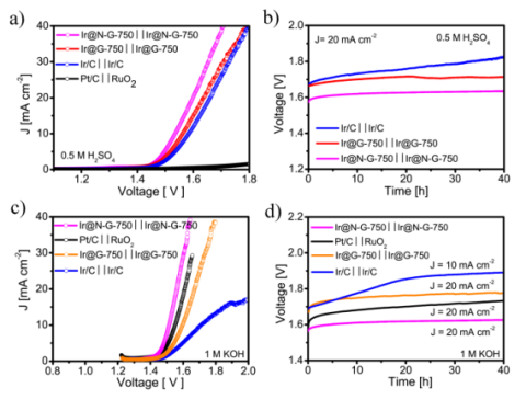 电解水制氢是通往可持续氢能源的重要一环。由于析氢(hydrogen evolution reaction, HER)和析氧(oxygen evolution reaction, OER)两个半反应的动力学迟缓,电解水制氢技术目前存在着能量转换效率低、催化剂成本高等难点。在本研究中,课题组选用氮掺杂石墨烯为载体材料,负载贵金属铱超小纳米颗粒(直径2.18±0.92 nm,负载量3.21 wt%)。该催化剂在酸性和碱性条件下都表现出优异的析氢和析氧催化活性和稳定性,作为双功能催化剂用于全电解水反应时,可在1.6V槽压下实现稳定的20 mA cm-2电解水。进一步的实验和理论研究表明:这一催化剂中存在丰富的铱-氮配位作用和金属-载体间电荷转移,调制了金属铱电子结构,从而提高了催化活性和稳定性。