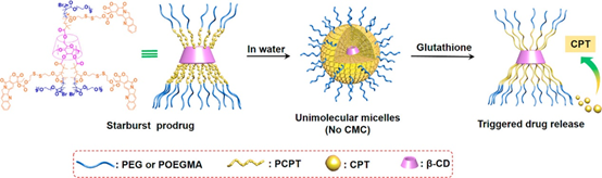 癌症是威胁人类健康的头号疾病,理想的治疗策略不仅要提高抗癌疗效,还要避免发生药物毒副作用。聚合物纳米诊疗系统具有可设计的前药结构与功能、药物单体的多样化、强健的稳定性以及良好的生物相容性等特点,可有效解决常见抗癌药物分子在递送过程中所表现的水溶性差、药物活性易破坏、药代动力学效果差以及非靶向递送等问题,有利于提高药物疗效和降低毒副作用,在当前肿瘤治疗中拥有独特的优势。然而,现有聚合物前药控释系统仍存在急需解决的关键问题:由于存在临界胶束浓度值,两亲性线形聚合物经自组装所形成的胶束对自身浓度及环境因素(如有机溶剂、温度和pH值等)有较高的要求,导致其在血液循环过程中存在浓度依赖性,易造成胶束解组装,导致药物泄漏从而对正常组织产生毒副作用。为了应对疾病的多样性以及生物体内环境的复杂性,当前纳米药物领域急需开发新型载体以解决现有聚合物前药控释系统存在的问题。