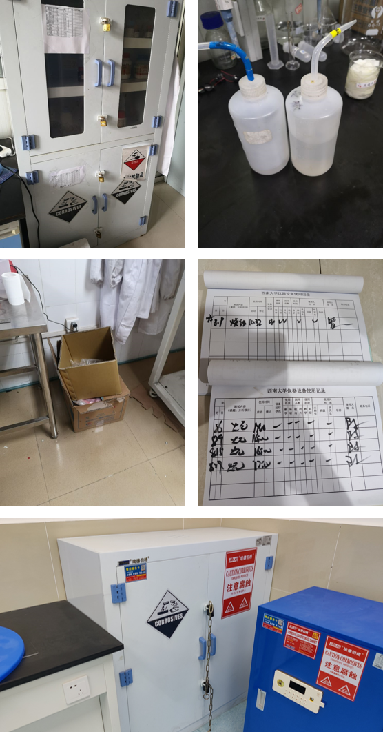 9月16日上午,学院党委书记李红带领学院安全工作组成员对21教、25教、86栋、89栋、麦田村实验室和新薄膜材料与器件中心进行每月例行安全检查,重点检查了实验室危险化学品存放和领用、实验室水电气管线和实验室卫生情况。本次检查未发现重大安全隐患,各实验室正常运转,但仍存在一些问题。首先是多个实验室存在的共性问题:化学药品清单未按月更新。除此之外,个别实验室还存在试剂瓶和自制溶液瓶上没有贴标签、高温设备使用登记记录信息不完整、易制爆药品放在带玻璃窗的柜子中、双锁柜上无药品清单、实验室卫生情况较差等问题。学院安全工作组对检查中发现的问题作了详细记录,要求相关责任人高度重视,尽快完成安全问题整改,进一步强化实验室管理,为广大师生营造一个和谐安全的实验环境。