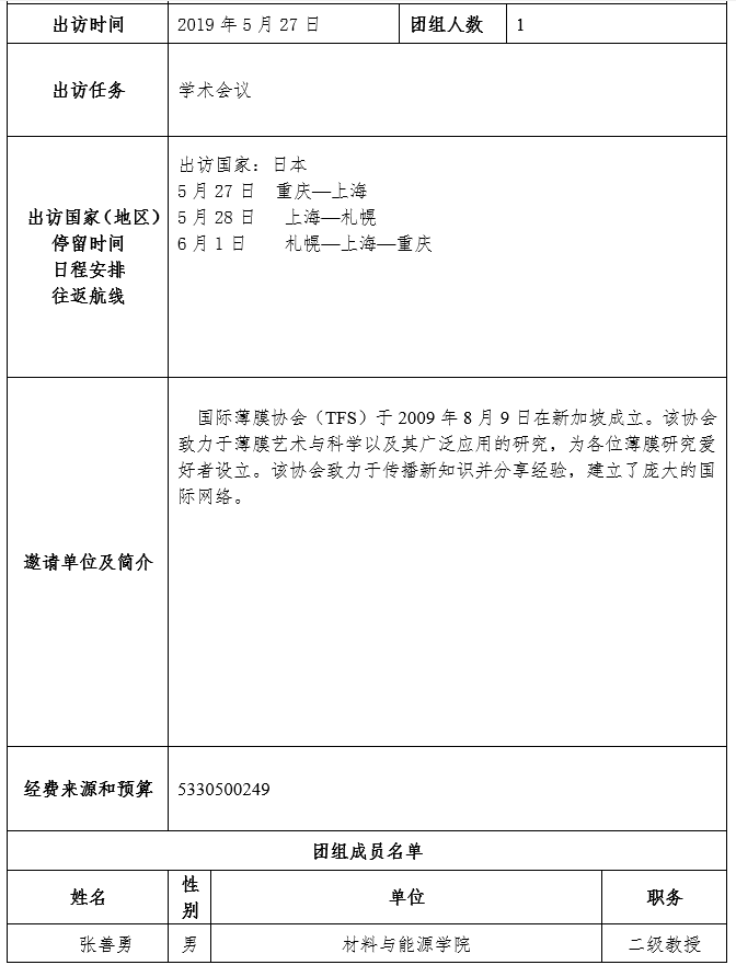 因公临时出国(境)团组信息公示(张善勇)