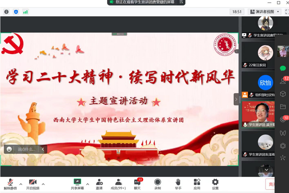 为积极响应学校党委《关于开展学习贯彻党的二十大精神宣讲工作的通知》要求,深入推进党的二十大精神在我院进年级、进班级、进支部,掀起学习宣传贯彻党的二十大精神的热潮,2022年12月23日下午两点,学院团委邀请了我校马克思主义学院“中宣团”的六名成员开展了“学习党的二十大,续写时代新风华”主题线上团课,我院本科及研究生党员、入党积极分子、团委学生会干部以及班团干部等参加了此次线上团课。