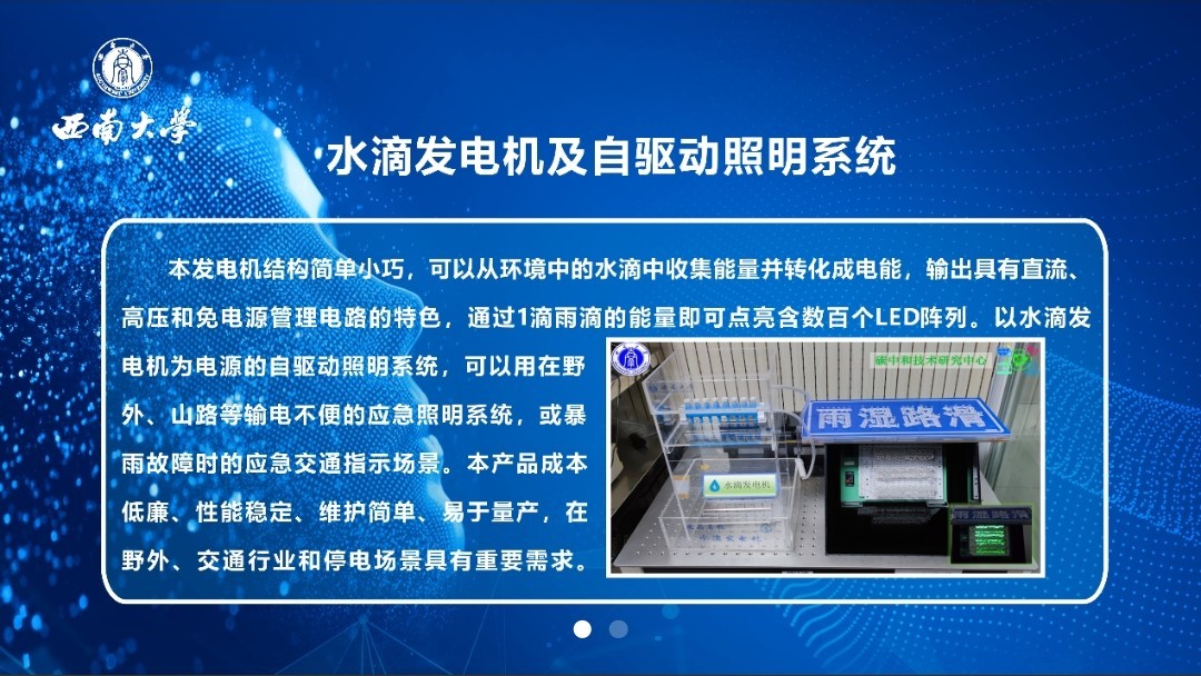 “汗液激发供能服装”项目依托best365英国在线体育官网主动健康监测材料与技术中-新联合研究中心,开发了一种透气可洗的柔性汗液激发供能智能传感服装,集自供能传感、印刷电路控制以及户外环境温度监测等供能于一体,为实现多功能集成可穿戴设备提供了一个新的解决方案。而“水滴发电机及自驱动照明系统”所展出的发电机结构简单小巧,可以从环境中的水滴中收集能量并转化成电能,输出具有直流、高压和免电源管理电路的特色,通过1滴雨滴的能量即可点亮含数百个LED阵列。以水滴发电机为电源的自驱动照明系统,可以用在野外、山路等输电不便的应急照明系统,或暴雨故障时的应急交通指示场景。该产品成本低廉、性能稳定、维护简单、易于量产,在野外、交通行业和停电场景具有重要需求。