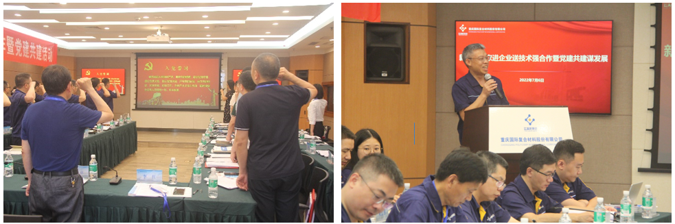 下午座谈会由重庆市新材料产业联合会常务副会长兼秘书长王敬贵主持。会议开始,李红书记带领全体参会党员同志重温了入党誓词。随后,云天化集团党委常委、重庆国际复合材料股份有限公司党委书记庾波介绍了公司的发展历程、主要产品以及应用领域、党建如何引领企业高质量发展等情况。