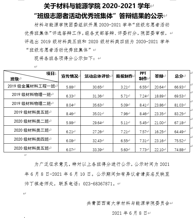 2020-2021年度班级志愿者活动优秀班集体评选公示