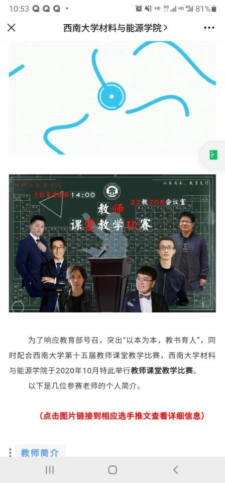第二阶段,说课网络评比。六位参赛教师录制说课短视频、制作个人简介及课程介绍,发送微信推文,由全院教师和学生共同投票评选。具体网址连接如下:https://mp.weixin.qq.com/s/UHHTdOcpZV3yUOozlwaj3w
