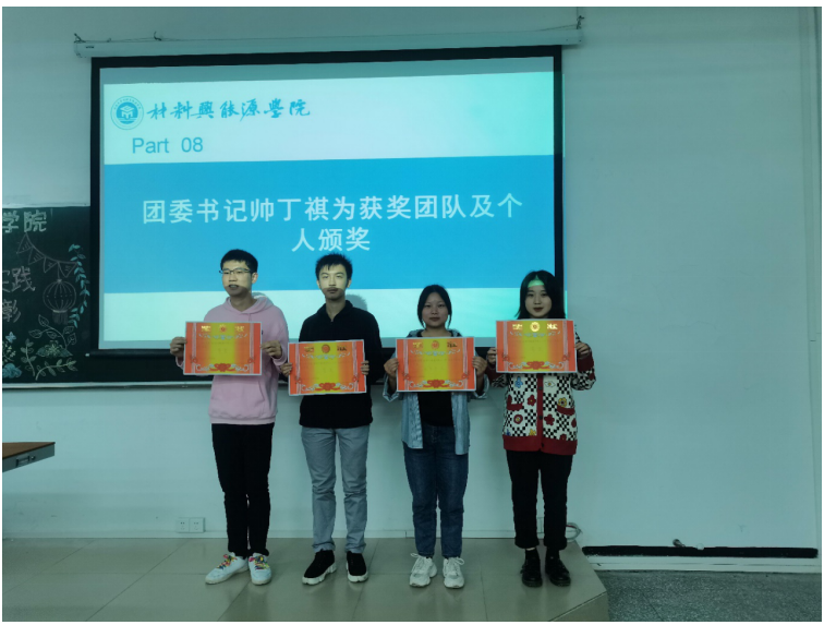 大会高潮,由各小分队进行活动展示分享,讲述实践活动中的成果以及发现的问题,做出调整和总结内容,使同学们认识到三下乡活动的真实意义。然后就业实践部部长毛秋介绍评优大会评优细则以及奖项设置,继而材料与能源学院学生会主席谢勤展示得分总表并宣布评选结果,同时由团委书记帅丁祺老师颁奖,大会尾声,由帅丁祺书记总结陈述,提出表扬和值得改进之处,到此,大会圆满成功。