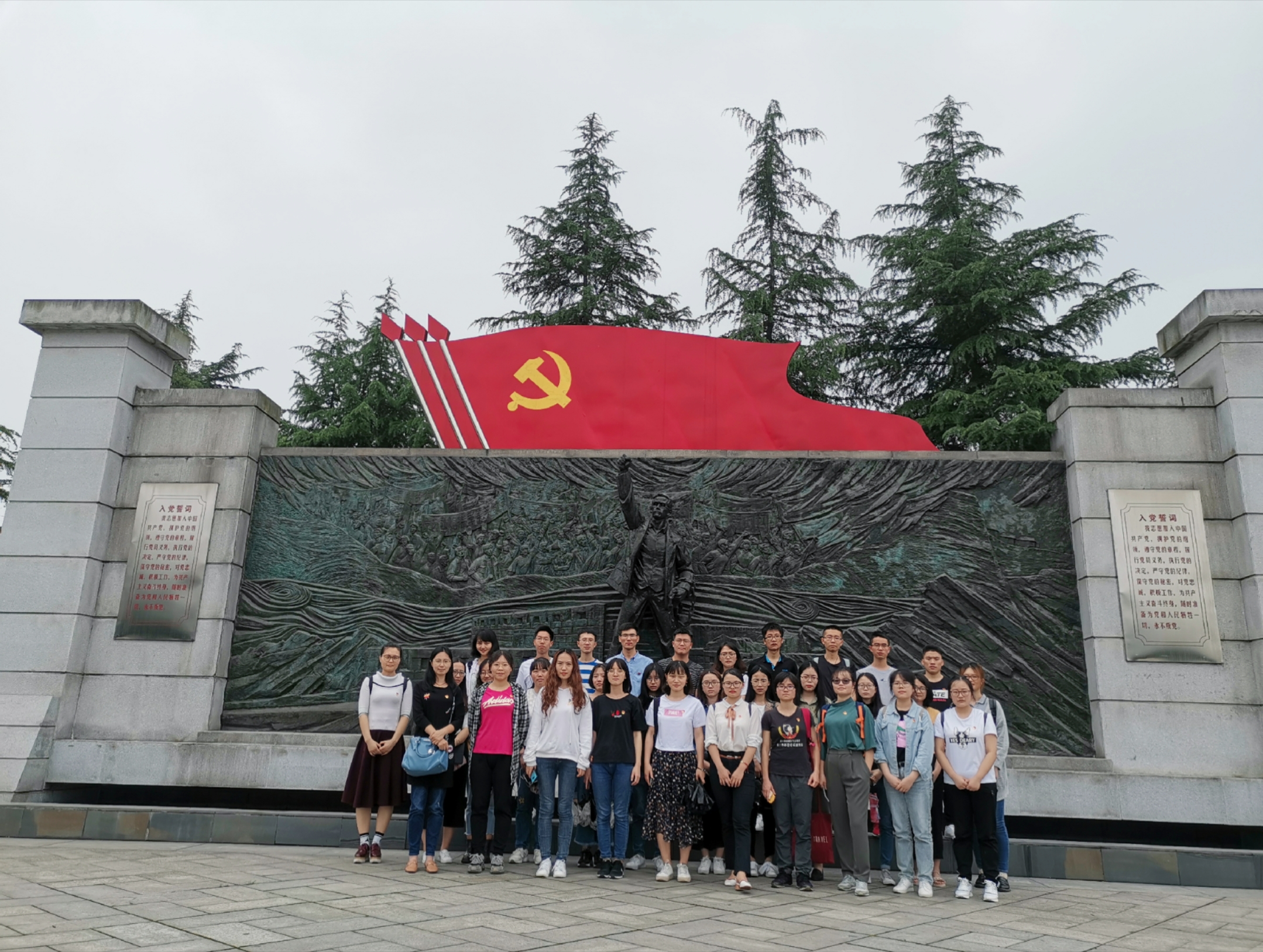 下午,学生党员来到杨闇公陵园上了一堂特殊党课。庄严肃穆的杨闇公烈士陵园里, 70余米长的陵道蜿蜒曲折,两旁的331棵塔柏笔直挺拔,一座巨幅雕像伫立在广场上,静静的凝视着远方,墓墙上邓小平同志亲笔题写的“杨闇公烈士永垂不朽”几个金色大字熠熠生辉。沿着陵道缓缓前行,在杨闇公生平浮雕前驻足凝望,追思他“人生如马掌铁,到死方休”的一生;在墓茔处三鞠躬,深切缅怀他立党为公、执政为民的一生;在巨幅雕像下,紧握右拳,重温入党誓词,“我志愿加入中国共产党……随时准备为党和人民牺牲一切,永不叛党”,誓要不忘入党初心,弘扬先辈精神,争做有为青年。