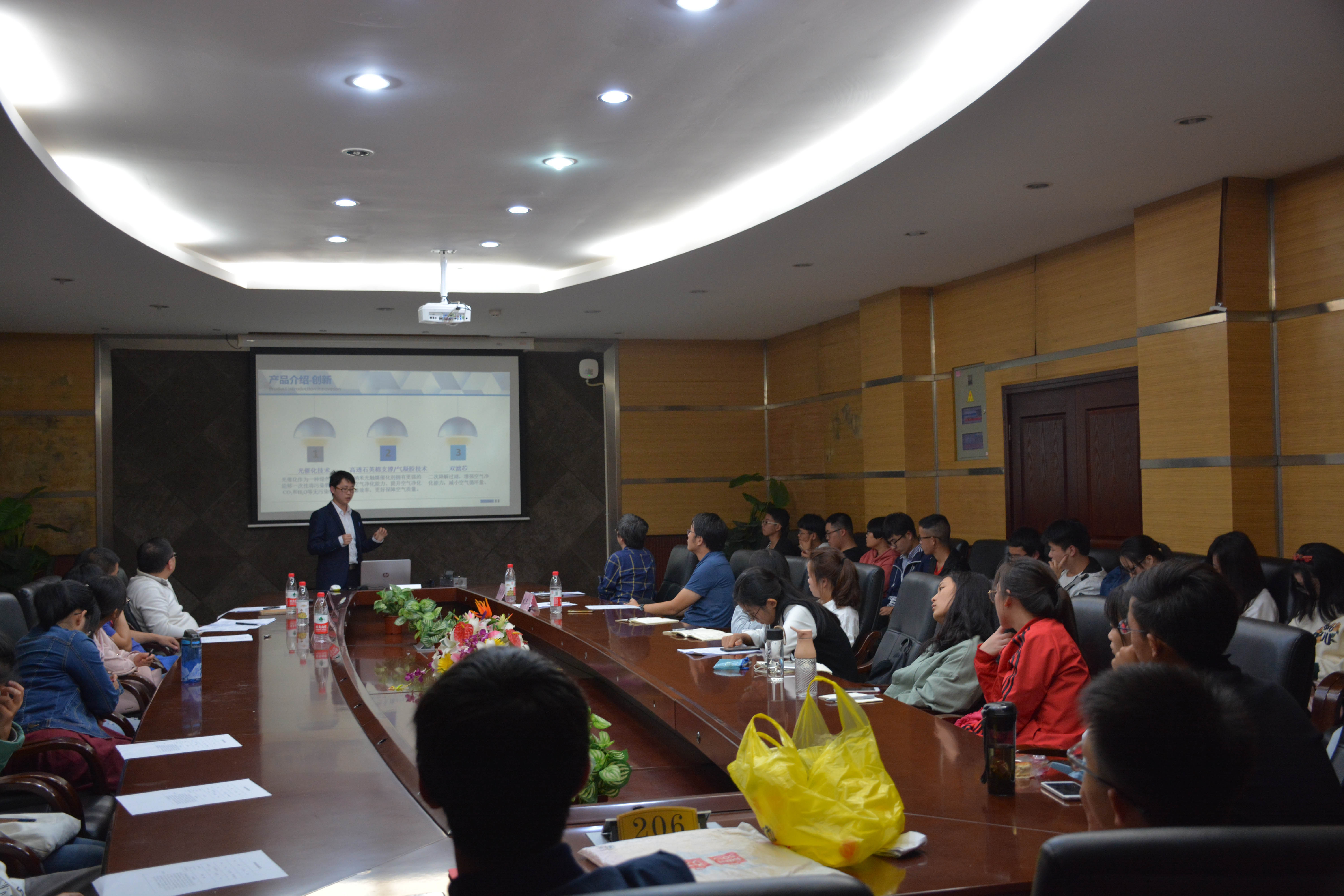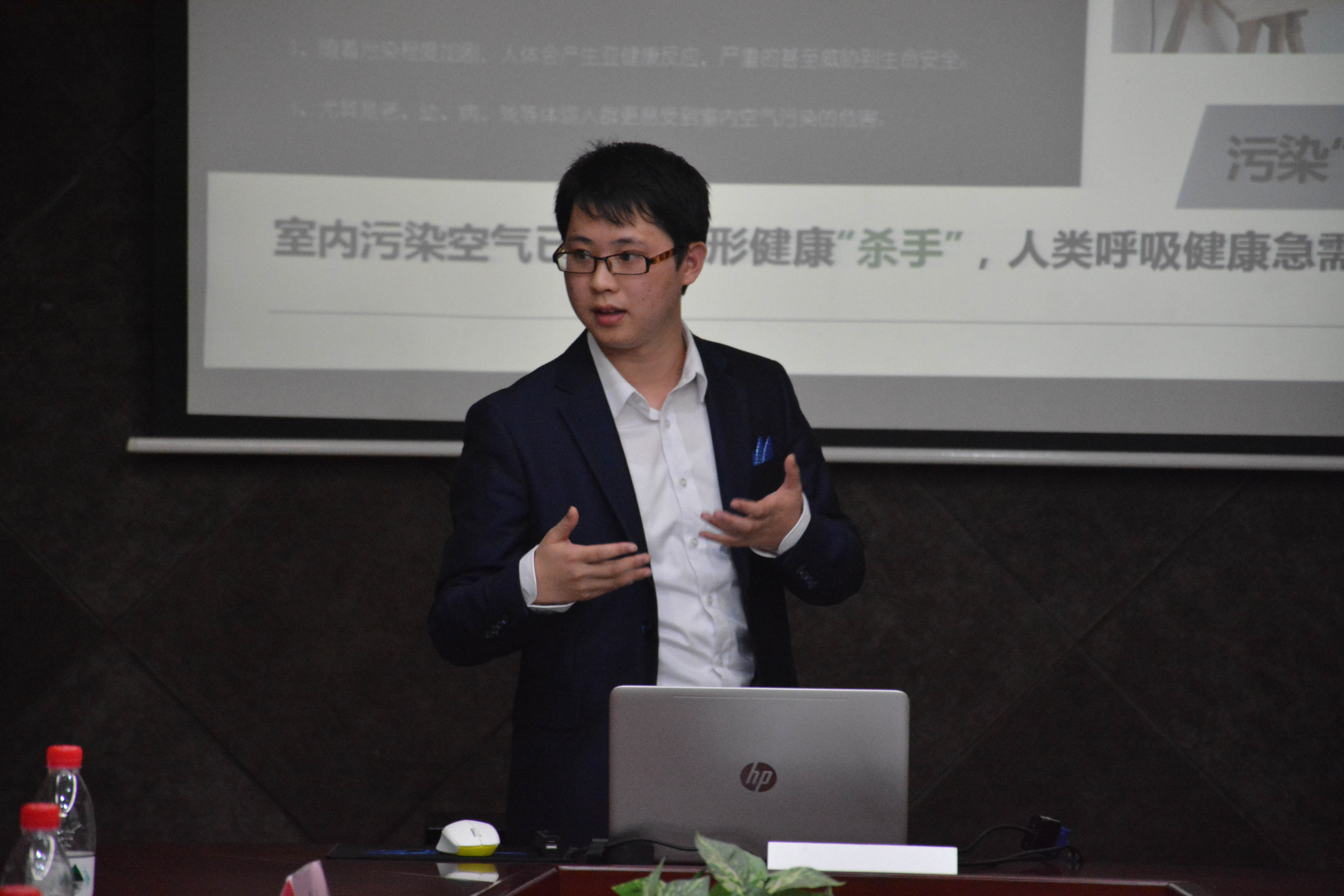 在科技发明类展示环节,窦海龙介绍了其发明成果—新型光触媒媒车载/家用空气净化器,他分别从研究背景、成果主要原理、市场化等方面做了详细介绍,通过一系列的数据说明了该成果在各项测试中表现出的优越性能,目前已申请专利。各选手自我展示结束后评委分别对其研究内容进行了质询提问。