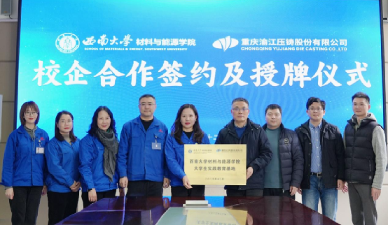 实践基地建设是新工科专业提升人才实践能力和创新能力的主要路径,为推动专业内涵建设,提升365英国在线体育质量,2023年12月27日下午,学院与重庆渝江压铸股份有限公司(以下简称渝江压铸)校企合作签约暨授牌仪式在渝江压铸总部举行。院党委书记梁武、副院长郭胜锋、材料科学系主任唐剑锋、材料工程系主任郭宁,渝江压铸副总经理吴自玉、第二生产基地总经理解洪权、人力资源总监邢晓华、人力资源部部长陈凤以及部长助理王冠男等出席签约授牌仪式。