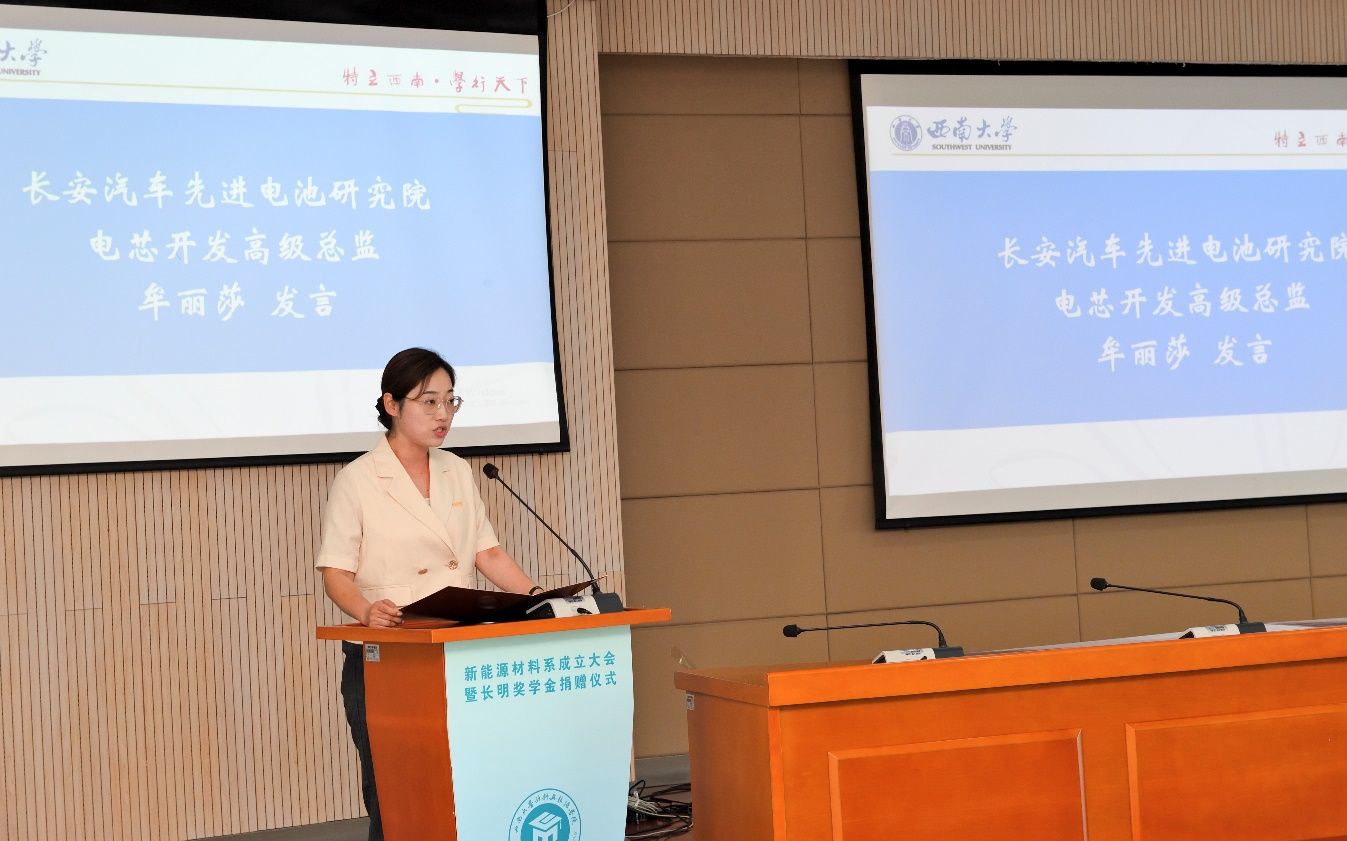 中南大学冶金与环境学院副院长刘芳洋教授、长安汽车先进电池研究院电芯开发高级总监牟丽莎进行了大会发言,对新能源材料系的成立表达了热烈的祝贺,同时也传递了加强优质合作的决心与信心。