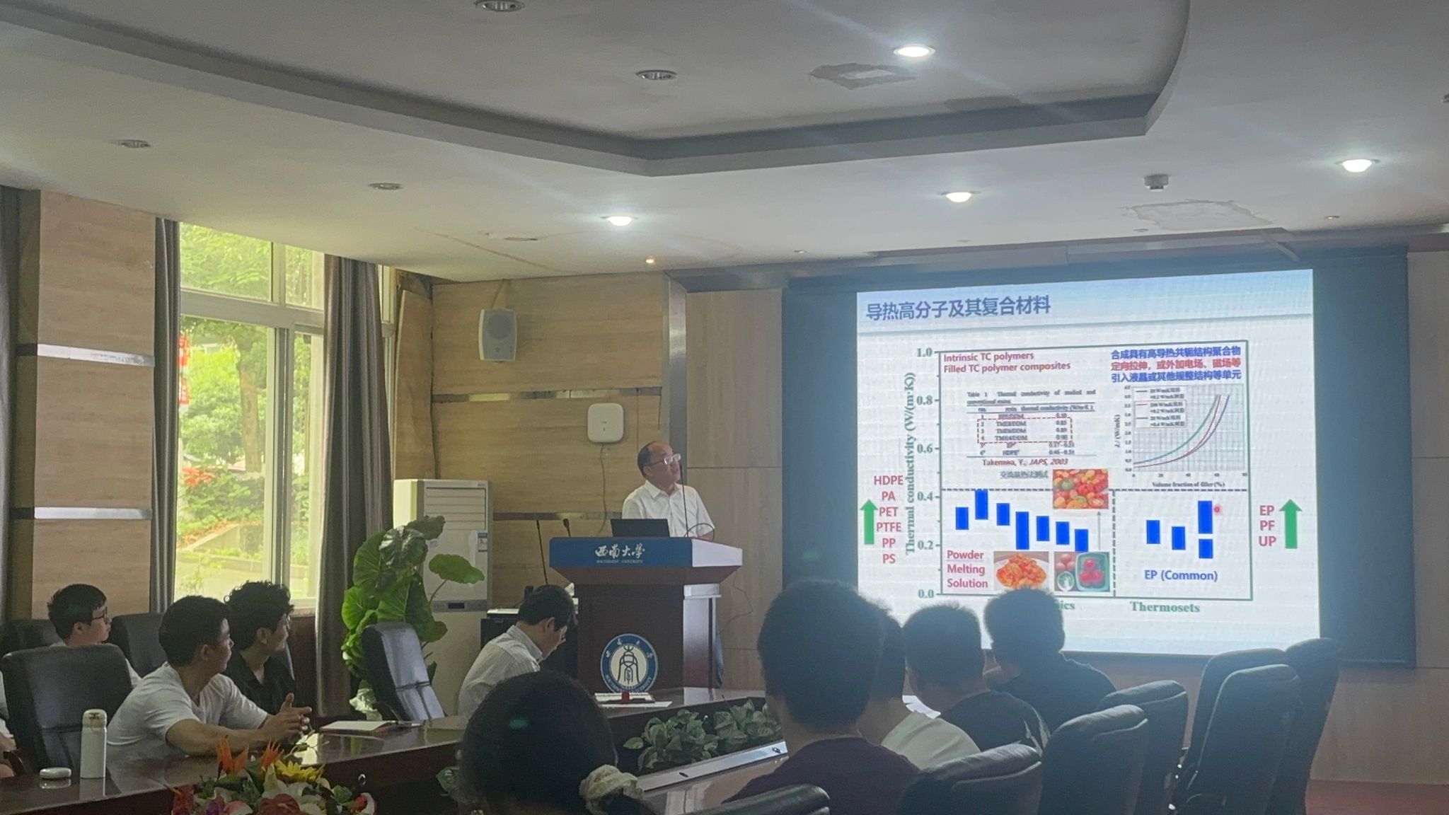 顾军渭教授作为国内材料科学领域的知名学者,围绕“结构/功能高分子复合材料(SFPC)在导热散热领域的研究进展”这一主题,为我院师生带来了一场精彩纷呈的学术报告。他指出,随着航空航天武器装备、特高压输电设备和5G通讯智能化控制系统等电子和电气技术的高速发展,日益突出的导散热问题已成为阻碍大功率电子元器件、超大规模和超高速集成电路,以及特高压输电设备乃至整个电子、电气产业发展的瓶颈问题。高分子材料虽然具有质轻、易成型加工、化学稳定性优良和成本低等显著优点,但其本体导热系数低,难以满足高功率化、高密度化和高集成化电子元器件以及特高压输电设备对高效快速导/散热的需求。针对这一挑战,顾教授详细介绍了其课题组在分子微观结构的有序设计、多尺度导热通路设计,导热填料-导热填料、导热填料-高分子基体界面优化调控,导热模型、导热经验方程构建及导热机理丰富等方面的研究进展。报告内容深入浅出,既有理论深度,又紧密结合实际应用,充分展现了高分子复合材料在导热散热领域的广阔前景与重要意义,引发了在场师生的热烈讨论与高度关注。