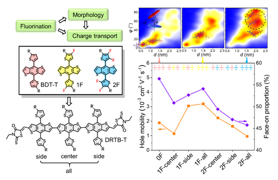 助力中国早日实现二氧化碳排放量与吸收量持平的碳中和目标需要绿色可持续能源,发展有机光伏产业是实现这个目标的重要方向。有机太阳能电池具有柔性好,成本低,可利用现代化学工业可大面积制备等优点,因而受到研究者的广泛关注。噻吩取代的苯并二噻吩(thiophene substituted benzo[1,2-b:4,5-b′]dithiophene, BDT-T)是当前高性能有机光伏材料的基本结构单元之一,被广泛应用于目前最优异的小分子和聚合物给体材料中。已有的实验结果表明BDT-T单元的侧链噻吩的氟化是一种很有潜力的给体材料的改性方式。然而BDT-T侧链噻吩氟化对小分子给体材料的堆积形貌和空穴迁移率的影响机制还没有被充分理解。