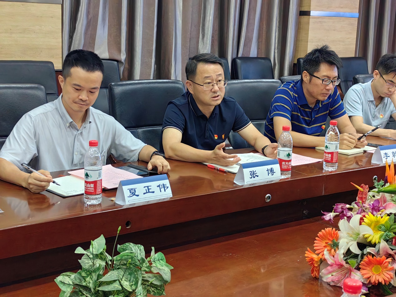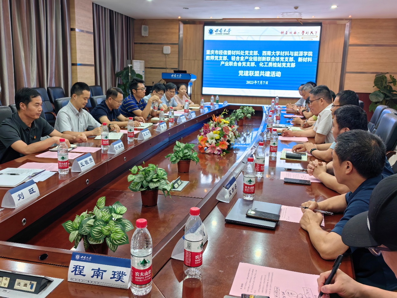 为深入开展学习贯彻习近平新时代中国特色社会主义思想主题教育,落实新时代党的建设总要求,以高质量党建推动政行院企深度合作交流,更好服务区域经济社会发展,构建政校行企协同育人新格局,7月7日下午,学院党委与重庆市经济和信息化委员会材料工业处党支部、轻合金产业链创新联合体党支部、新材料产业联合会党支部、化工质检站党支部联合开展“以学促干,政行院企共建谋发展”党建联盟共建活动。学院党委书记梁武、院长徐茂文、副院长徐立群、副院长郭胜锋、各科研团队负责人、教师第一党支部党员,市经信委材料工业处处长兼支部书记张博、副处长李乾锋、副处长夏正伟及支部党员,新材料产业联合会秘书长王敬贵,轻合金产业链创新联合体秘书长刘旺,重庆化工质检站站长兼支部书记王裕明、副站长席敏等30余人参加活动,活动由梁武主持。