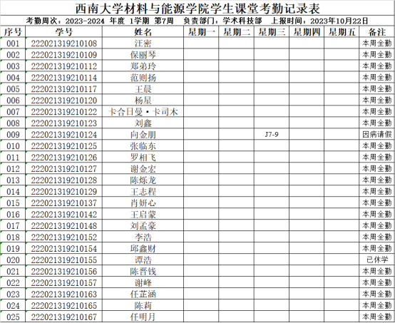 21级金属材料3班第7周考勤表