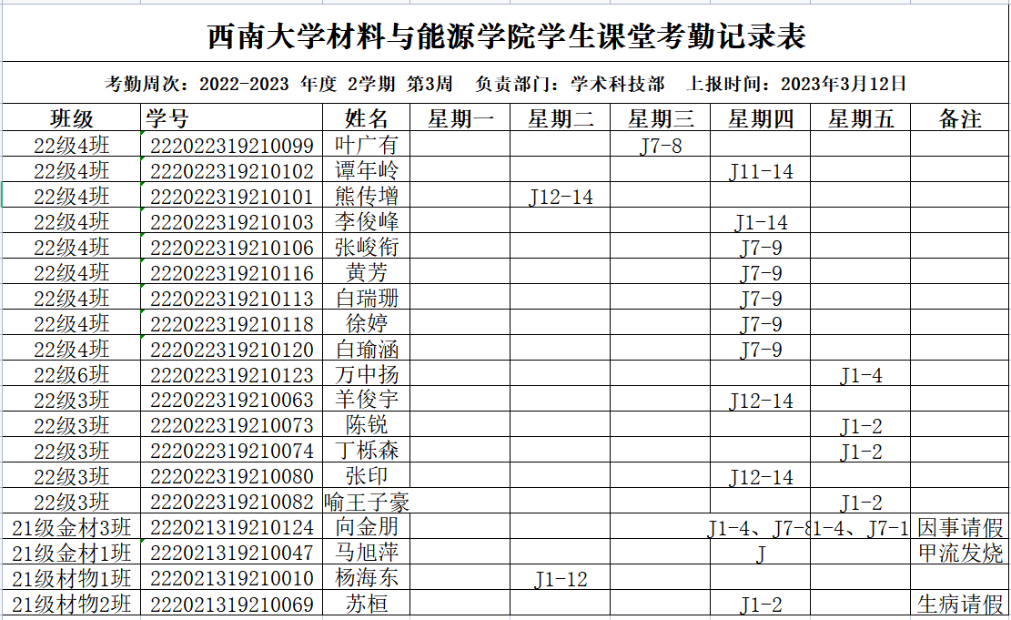 2022-2023年度第二学期材料与能源学院第三周考勤表